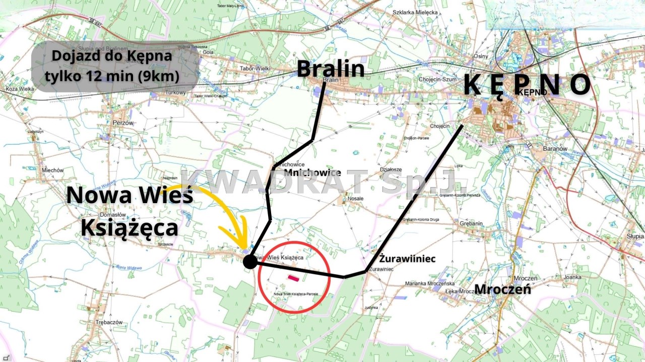 KWADRAT prezentuje na sprzedaż działki budowlane położone w miejscowości NOWA WIEŚ KSIĄŻĘCA gm. Bralin. Nieruchomości znajduje się w odległości ok. 9 km od Kępna (12 min samochodem) oraz ok 6 km od Bralina.