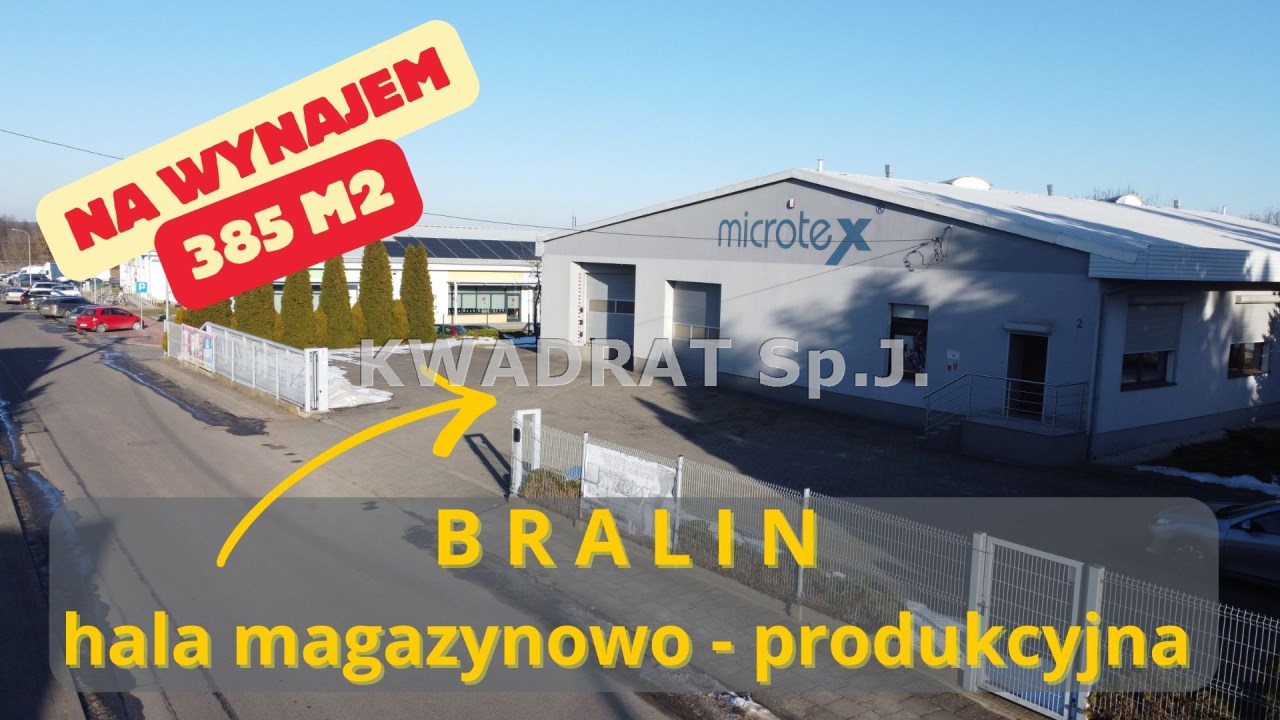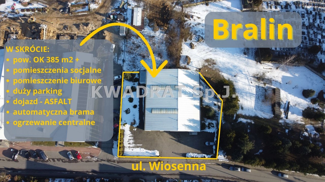 KWADRAT prezentuje na WYNAJEM: hala magazynowo – produkcyjna położona w Bralinie przy ulicy Wiosennej o pow. ok. 385m2.