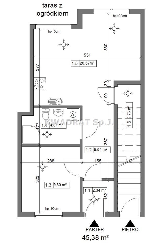 Lokal znajduje się na parterze domu w zabudowie szeregowej i posiada powierzchnię 45,38 m².