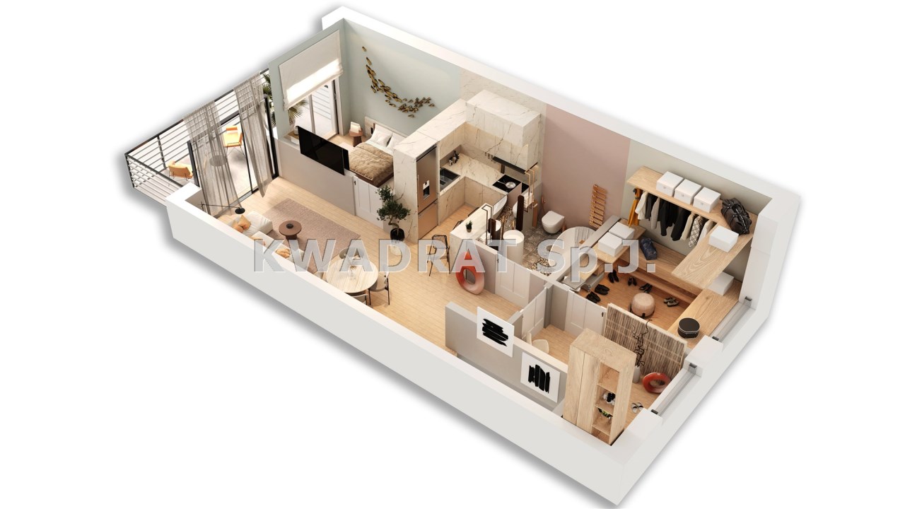 - 61,48 m2 (piętro – taras, salon z aneksem kuchennym i dwie sypialnie)