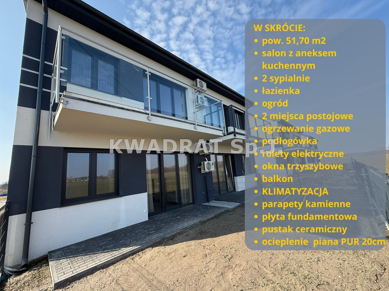 KWADRAT prezentuje na sprzedaż nowe, wygodne mieszkanie położone w Hanulinie (Zosin). Lokal położony jest na parterze domu w zabudowie bliźniaczej. Powierzchnia całkowita 51,70 m2. Oferowane mieszkanie posiada duży, ustawny salon wraz aneksem kuchennym i bezpośrednim wyjściem na ogród, 2 sypialnie oraz łazienkę. Do mieszkania przynależne są dwa miejsca parkingowe.
